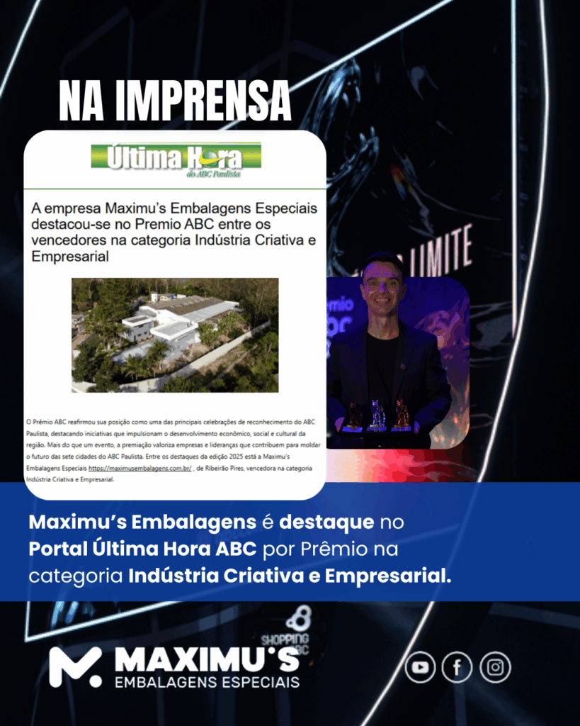 O portal Última Hora ABC repercutiu a premiação que a Maximu’s Embalagens Especiais ganhou no Prêmio ABC, na categoria Indústria Criativa e Empresarial. A companhia venceu com o case “Plástico não é o vilão”, que demonstra como a empresa tem transformado resíduos plásticos em novas embalagens, unindo tecnologia, responsabilidade ambiental e visão de futuro. Leia […]